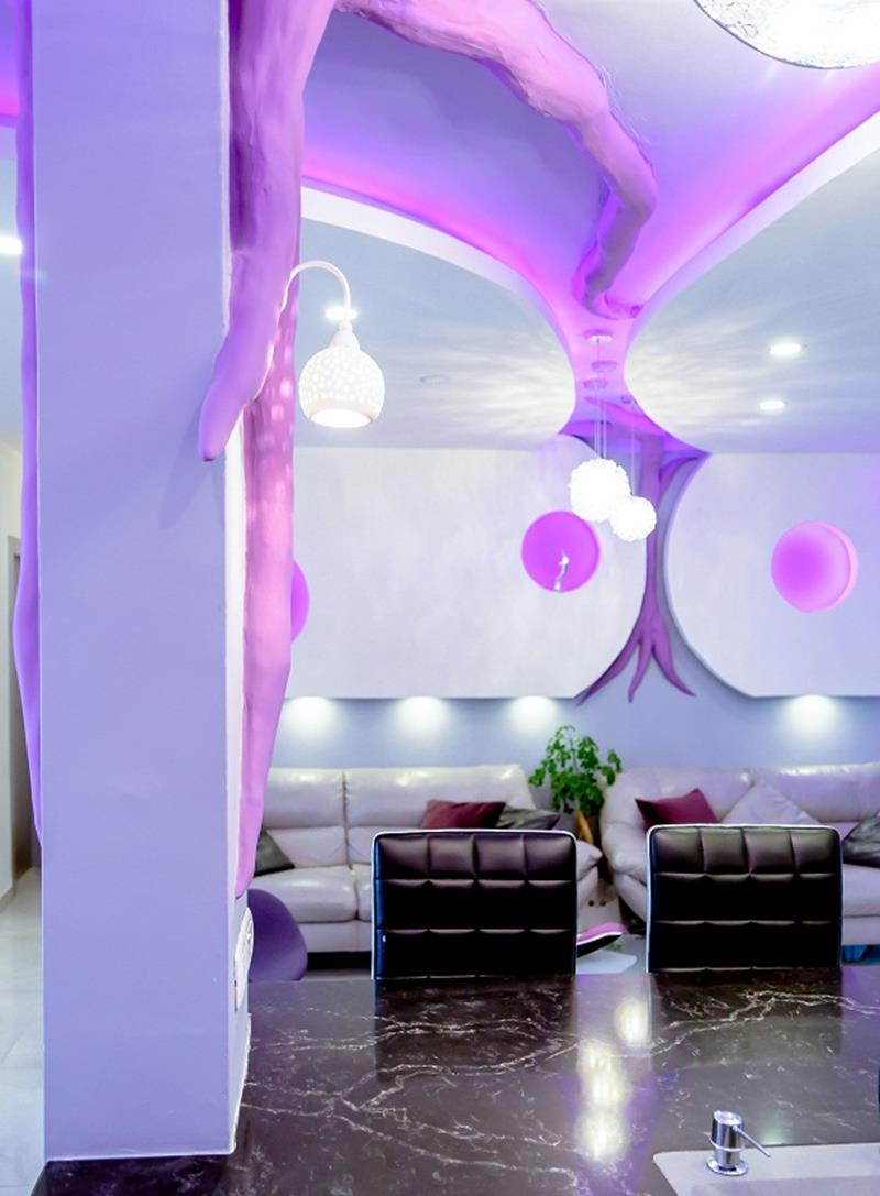הקונספט הראשי בחלל הוא צמיחה מחדש – חיים חדשים. הוא צומח לתקרה ומלווה את האלמנט התיקרתי לכל אורך החלל המאוחד. אלמנט הגבס הוא עצם בתוך החלל הגדול עם תאורה נסתרת. ההשראה לצורות של הנישות בקירות ובתקרה היא מהבית הקודם, שעוצב גם כן על ידי המעצב. הצורות יוצרות דינמיות ודו שיח בין התקרה, הקירות והעמודים. צורת הספרייה היא שילוב של קשת אובאלית הבאה לידי ביטוי בתקרה ובמדפים האופקיים. האלמנטים העגולים הם אנטיתזה של הנישות הסגולות בסלון.