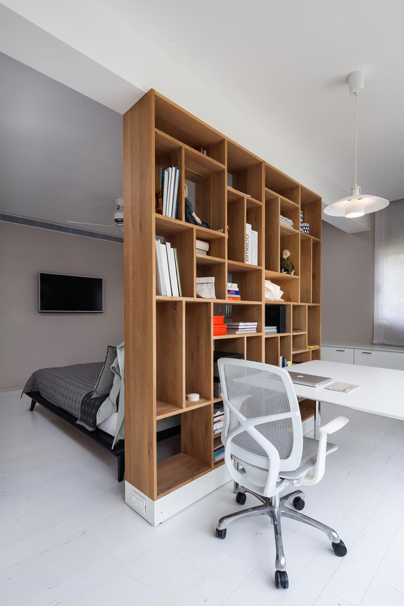 בעלי דירה ביקשו לשדרג את חדר השינה הפרטי.. מעבר לתחושה של נועם ורכות, הם ביקשו גם אזור עבודה נפרד ומקום אחסון. שתי ספריות מוקמו במרכז החדר, מתחת לקורה שיוצרת גם היא חציצה, והן מהוות קיר הפרדה אוורירי בין אזור השינה לאזור העבודה. מצד אחד הן מתפקדות כשידות לילה למיטה, ומצד שני כספרייה עבור חדר העבודה. כדי ליצור גובה לספריות, נבנתה במה בה ממוקמים מתגי החשמל והדלקות לתאורה.