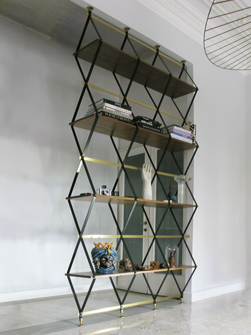 יש מי שמייעד את המחיצה לא רק לשם חלוקת החלל, אלא גם כדי לשמש כמדפים מרצפה ועד תקרה. מעצב הפנים והמוצר האיטלקי Pietro Russo יצר חלוקה רכה ואוורירית בין שני חלקי הדירה על ידי מבנה ורטיקלי, המשלב מדפי עץ וחלקי מתכת מוצלבים שיוצרים צורות גיאומטריות. השלד עשוי מברזל צבוע שחור והחלקים המצטלבים מפליז מוברש.
