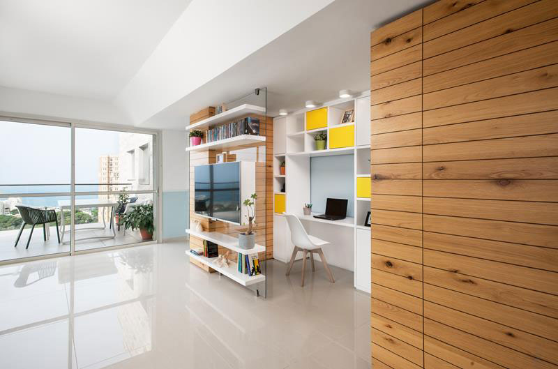 בדירה שבה הטלוויזיה מוקמה באזור רחב ידיים והייתה מרוחקת מדי מאזור הישיבה, תוכנן חלל עבודה באזור הכניסה לבית, שדופן אחת שלו עשויה זכוכית, והיא מתפקדת כבסיס לטלוויזיה. דופן זו משמשת גב לאזור העבודה ולמעה מקרבת את הטלוויזיה לאזור הישיבה. מסביבה כוורת של תאים פתוחים וסגורים לאחסון, המשתלבים ביחידה הנגרות כולה.