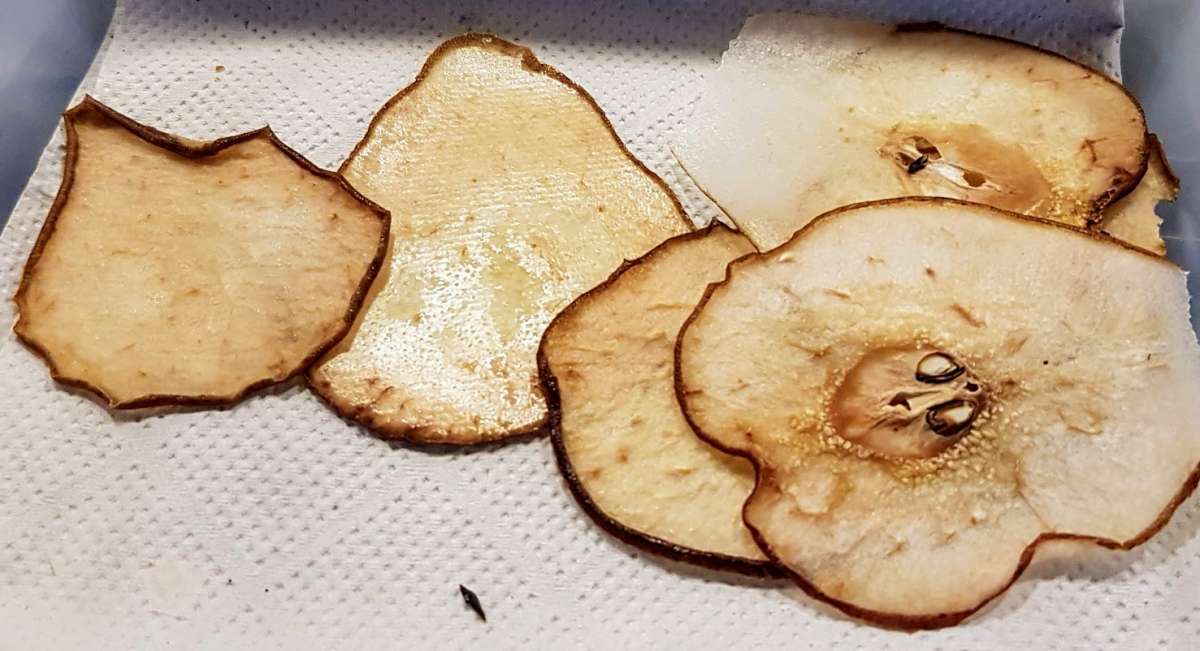 מכינים צ'יפס אגסים– מרתיחים מים עם סוכר ומיץ לימון. פורסים את האגסים לאורכם דק במנדולינה. מעבירים לסירופ החם ומבשלים כמה דקות על סף רתיחה. מסננים את האגסים מהסירופ ומעבירים למגש מרופד בנייר אפיה. מייבשים בתנור בחום של 100 מעלות למשך שעתיים שלוש עד קבלת צ'יפס פריך. מגישים עם מעט גבינה כחולה לצד המרק.