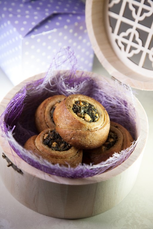 שבלולי שמרים נימוחים מקמח לחם מלא במילוי תרד כרישה ואגוזים.