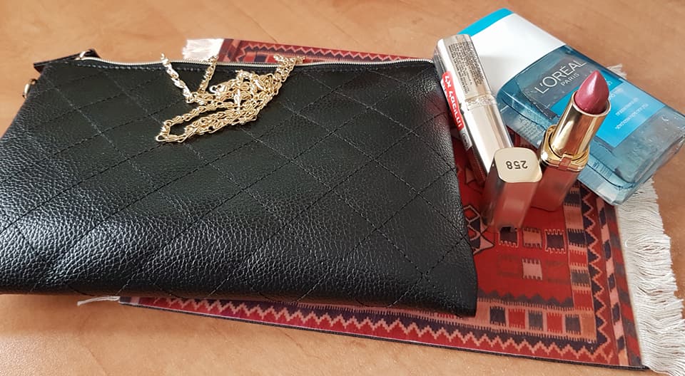 התיק אלגנטי וטרנדי במיוחד: שחור עם רצועת זהב דקיקה- יכול לשמש כתיק ערב, ומכיל 2 מוצרים בגודל מלא:
