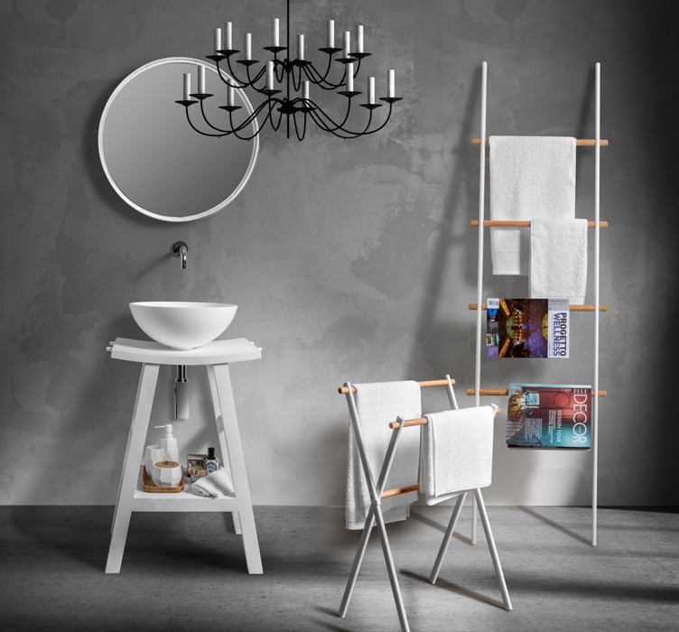 בין הפריטים ניתן למצוא: סל כביסה, מתלה למגבות, קונזולה לכיור מונח, שידות, מדפי אמבטיה מעוצבים ועוד .