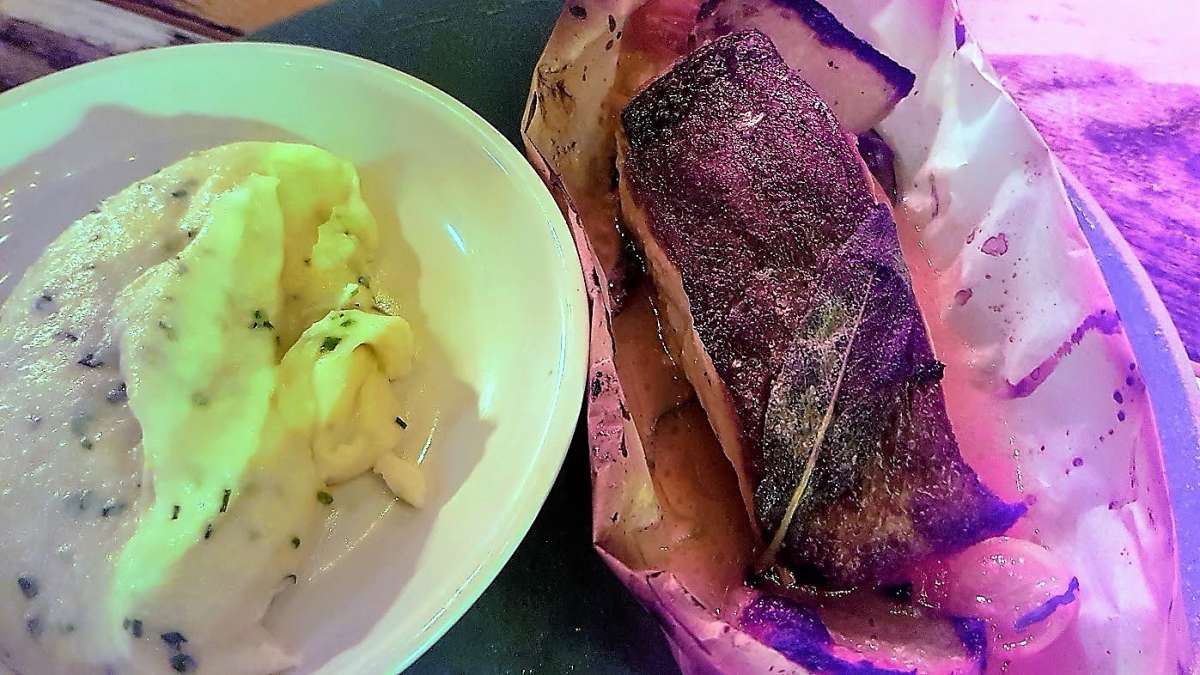 סלמון במעטפה פתוחה- עגבניות, זיתי קלמטה, טארגון, קולורבי צלוי, חמאה ומרווה, מוגש עם פירה קרם פרש ועירית- 96 שח. המנה מיוחד בהגשה של הדג במעטפת פתוחה יחד עם הירקות, הזיתים והפירה.