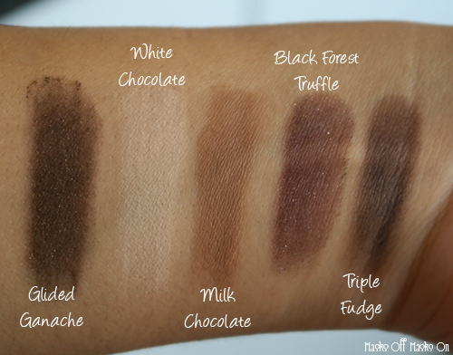 עוד בפלטה שלוש צלליות חומות-מוקה בגוונים שונים בגימור מט, אשר נהדרות במיוחד לטשטוש הצללית בשקע העין, ויכולות לשמש גם כברונזר לחיטוב הפנים (לא ברור למה צריך שלוש, אבל שיהיה), וגם שתי צלליות בהירות בגודל כפול: האחת, White Chocolate היא בגימור מט, ומצוינת להארת עצם הגבה, והשניה, Champagne Truffle , מעולה להארת ה-C הפנימי של העין, ויכולה לשמש גם כהיילייטר.