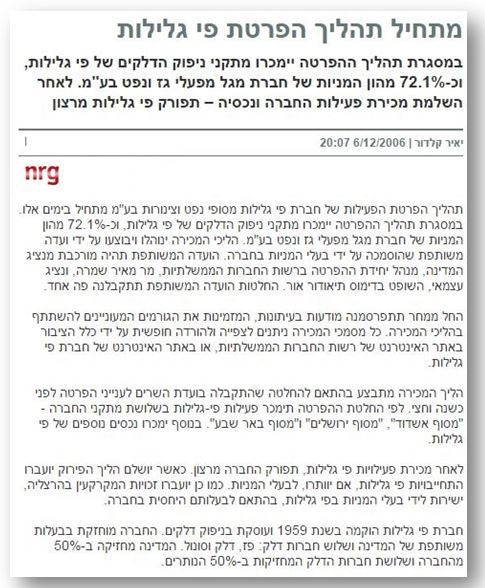 במסגרת תהליך ההפרטה של חברת פי גלילות, יימכרו מתקני ניפוק הדלקים בפי גלילות, כך פורסם בכתבה באתר NRG. בנוסף, יוצעו למכירה 72.1% ממניות חברת מגל ומפעלי גז ונפט בע"מ. לאחר תהליך המכירה תפורק חברת פי גלילות, המנוהלת על ידי אבי דותן, מרצונה החופשי.