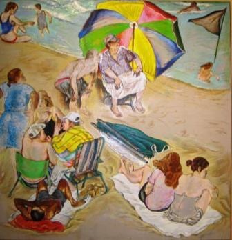 רבקה ססובר פלד – לדידה, החוף איננו מסתיים בתל אביב, אלא מגיע עד לעזה. רבקה מציירת קייטנת קיץ של ילדי עזה. ציוריה נלקחו מתוך צילומים של צלם העיתונות ניר כפרי. החוף העזתי, משקף סיטואציה דומה ועם זאת כ"כ שונה. לדבריה: "הילדים הם אותם ילדים שקועים בעולמם, טובלים בשמש אלכסונית… בתמונה הזויה של הקייטנה בעזה אי אפשר שלא לראות משל לטראגיות של המצב הפלסטיני". ואם בחופי הארץ באותו ים תכול ותחת אותה שמש מסנוורת נראה מעגן יאכטות, זוג אוהבים עם כלב, שם בעזה נראה בינות לילדים הצוהלים, חמור משכשך במים, דבר המבטא, לדברי הציירת, את "הגרוטסקיות של מצבם הקיומי". ואנו לא יכולים שלא להיזכר באמירתו האומללה של רוה"מ לשעבר, יצחק שמיר: "הערבים הם אותם ערבים והים הוא אותו ים…".