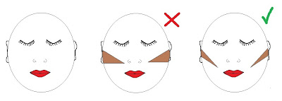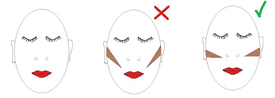 הדרך הנכונה לעבודה היא להניח את הברונזר לרוחב הפנים, בצורה יותר אופקית, מאמצע האוזן לכיוון האף/מרכז הפנים, כך: