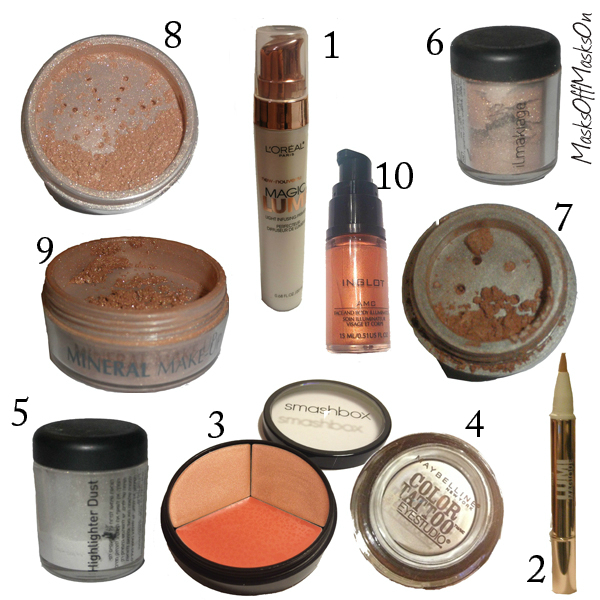 גיבשתי כאן שני קולאז'ים עם חלק מהמוצרים שאני משתמשת בהם להארות והצללות- פנים ועיניים. זה אמנם עמוס, אבל אני רוצה להמחיש לכן עד כמה באמת אין סוף לאפשרויות ולחמרים שאפשר להשתמש בהם. לנוחיותכן צרפתי גם קישורים לרכישה און ליין של חלק מהמוצרים: