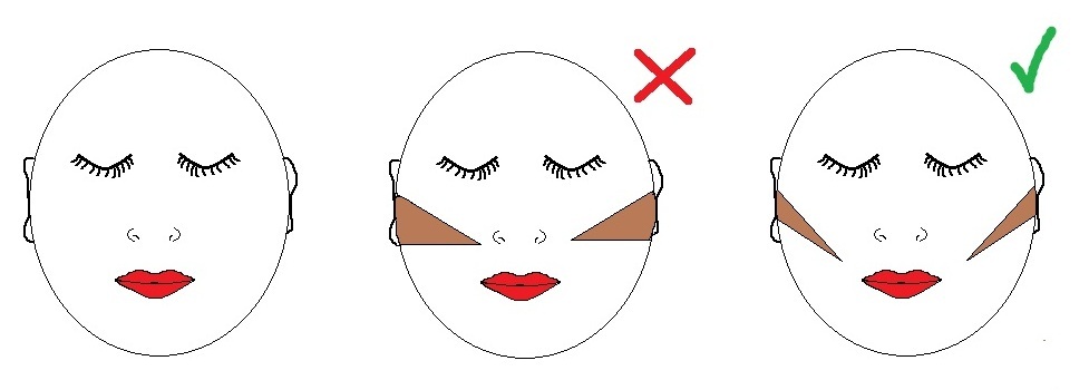 הדרך הנכונה לעבודה היא להניח את הברונזר לרוחב הפנים, בצורה יותר אופקית, מאמצע האוזן לכיוון האף/מרכז הפנים, כך: