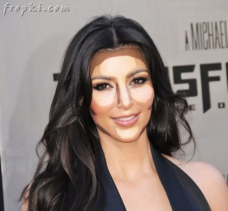 כמו שלמדנו בשיעור שעבר, נשתמש בברונזר כדי לצמצם שטחים רחבים בפנים, על מנת להדגיש את הצורה האליפסית האידאלית. בתמונות של קים רואים בבירור הצללה של מסגרת הפנים, ושל המצח בפרט, מה שגם מעט מקטין אותו, ועוד יותר גורם למרכז הפנים להראות זוהר יותר.