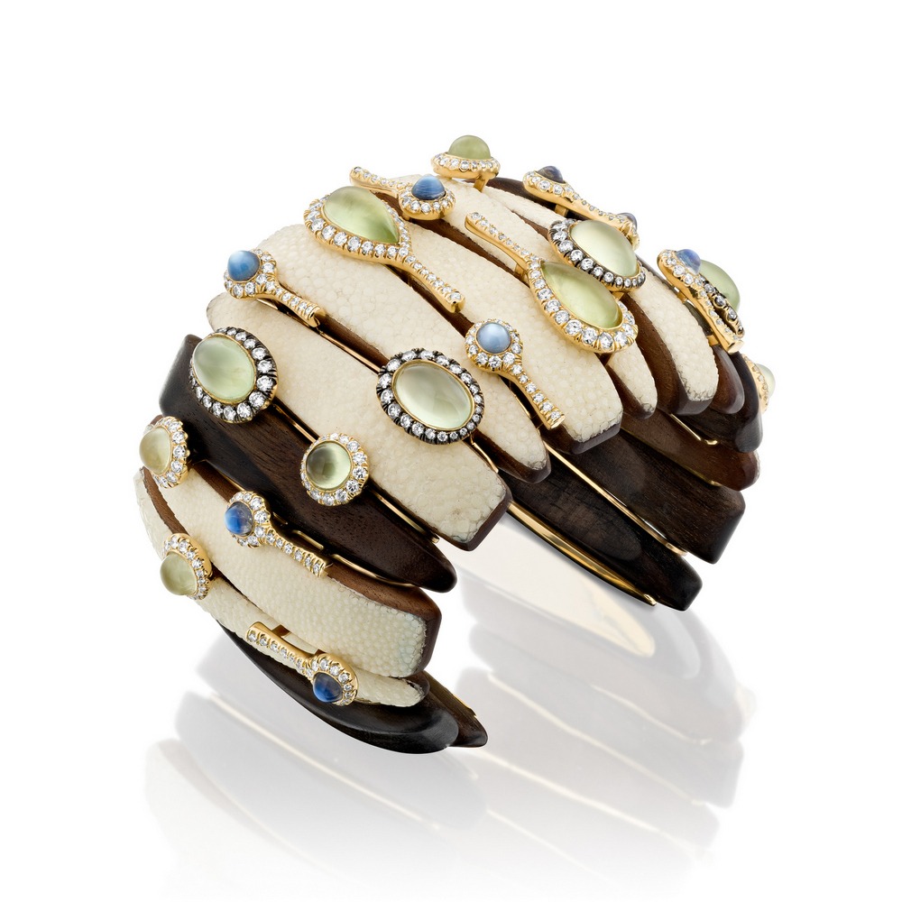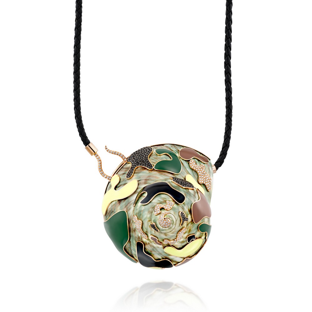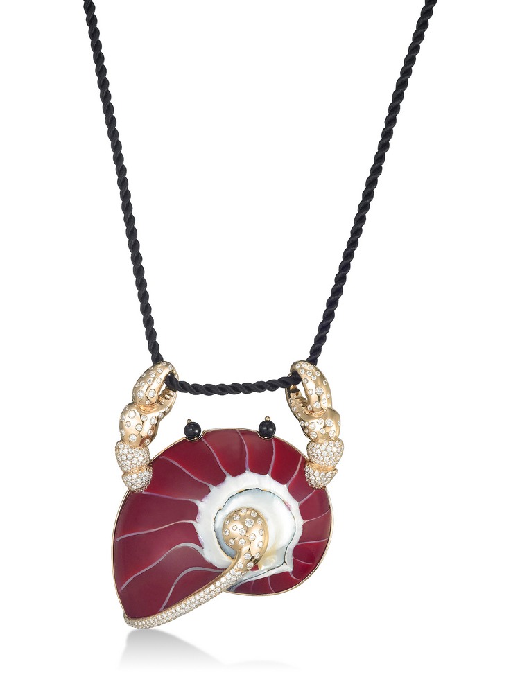 קונכיה טבעית ועליה פריטי צורפות עדינים בזהב, יהלומים ואבני חן.
