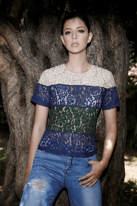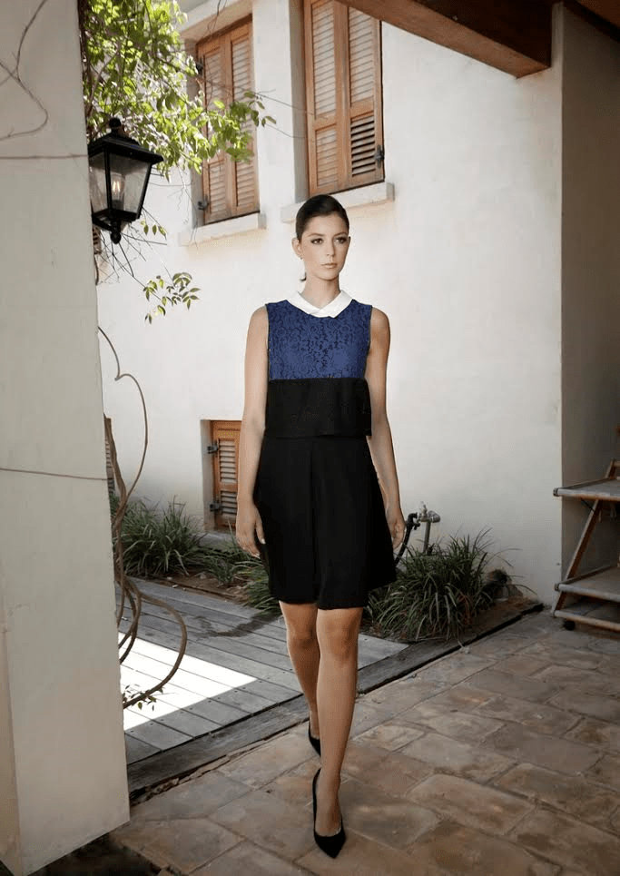 הדוגמנית ג'סיקה סטאם, לובשת כחול אלקטריק שקוף מעל תחרה שחורה בסגנון לנז'רה, בעיצובו של ג'ייסון וו
