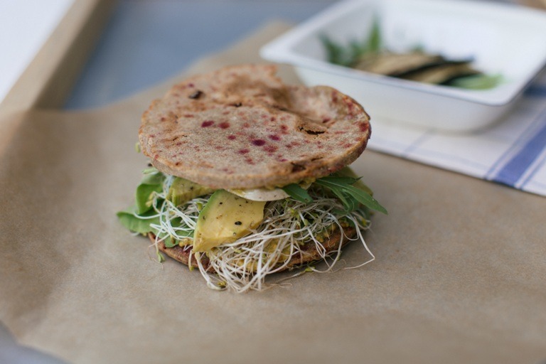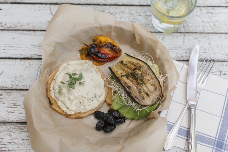 מחממים מונבט עדשים כתומות. חותכים אותו לרוחב כדי ליצור שתי פרוסות דקות. מורחים על הפרוסות שמן זית, טחינה עם עשבי תיבול, חציל אנטי פסטי, נבטי אלפלפא, חסה סלנובה, פלפלים קלויים, זיתי קלמנטה. אפשר להוסיף עגבניות שרי בתנור, שתורמות למתקתקות למנה.