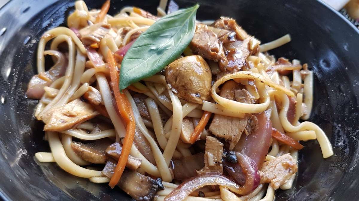 פאד וואן קאי נאא – אטריות אודון עם חזה אווז מעושן,בקר,עוף,גזר,בצל סגול,פטריות ובזיליקום ברוטב קפאו – מנה מצויינת למי שאוהב פיקנטי-חריף