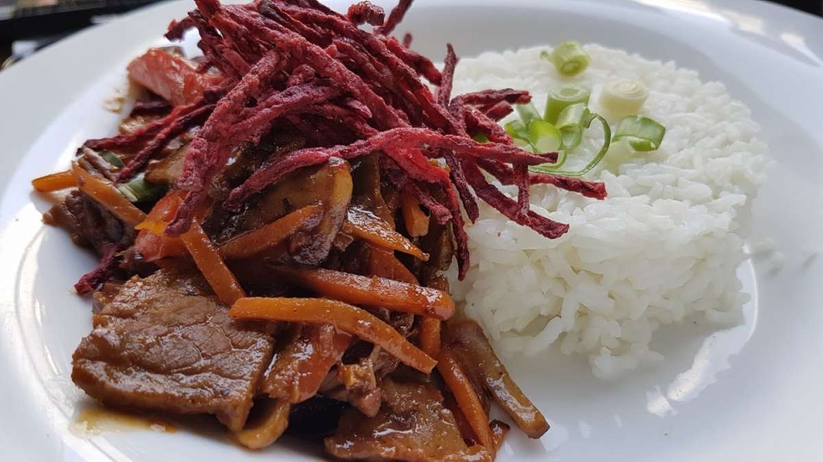 בקר סצואן – נתחי בקר, פלפלים בצבעים, בצל לבן ונבטים ברוטב סצ'ואן פיקנטי, מוגשת עם אורז מאודה – המנה הייתה טעימה אבל חריפה לי מדי.