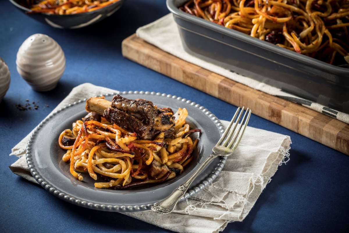 4. בתבנית מלבנית משומנת – רצוי מרופדת נייר אפייה משומן, מניחים מעט מהספגטי, מניחים את חתיכות הבשר והבצלים על התבנית, מפזרים ערמונים ושופכים את שמן הבשר מעל.