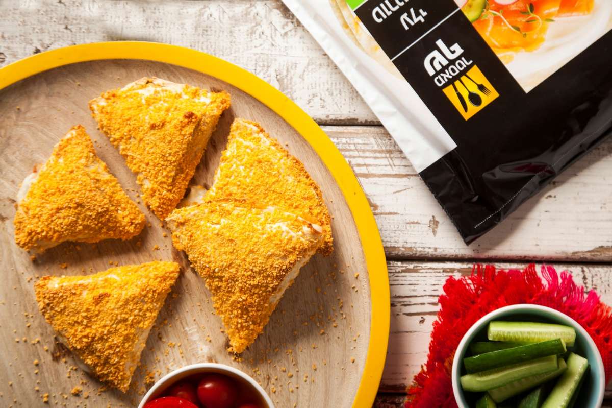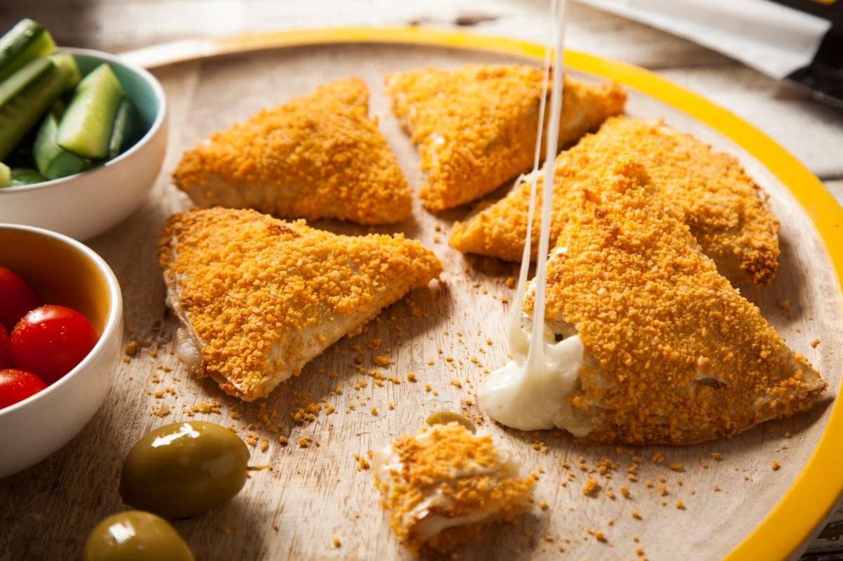 - חוצים כל טורטייה לחצי, מקפלים כל חצי לצורת משולש, ממלאים כל משולש בגבינה ובזיתים. טובלים בביצה טרופה ובפירורי לחם (בדיוק כמו שעושים שניצל).