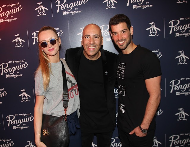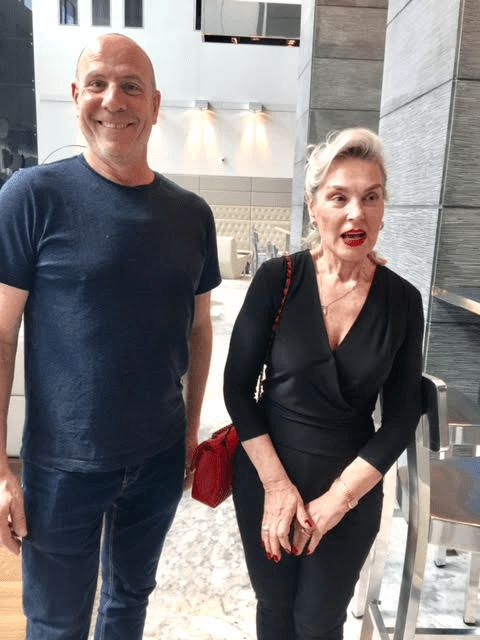 ברניי ביז'ו ובעלה הבמאי (הארטיסט) מייקל הזנביצ'יוס, היא לובשת שמלה מודפסת מבית ג'ימבטיסטה וואלי קוטור (אביב 2012)