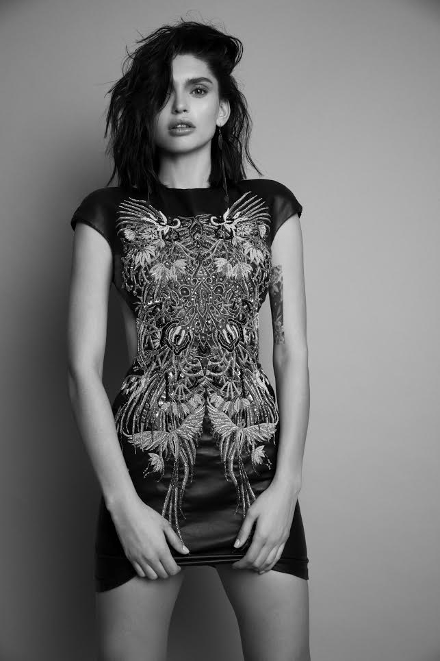 הדוגמנית נטשה פולי בשמלת תחרה שקופה ומרוקמת בדוגמאות גיאומטריות, של אמיליו פוצ'י