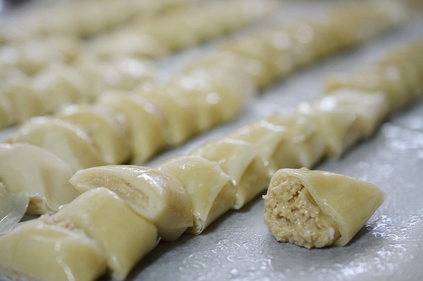 מרפדים תבנית בניר אפיה כאשר השולים בצדדים מחוץ לתבנית נשארים (מאוחר יותר מהווים מעטפת לעוגה)