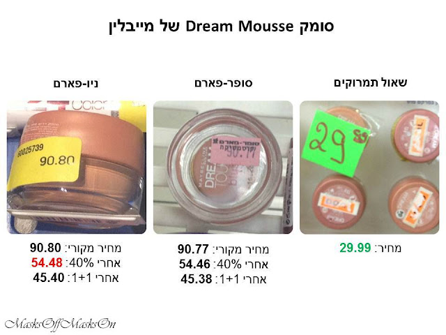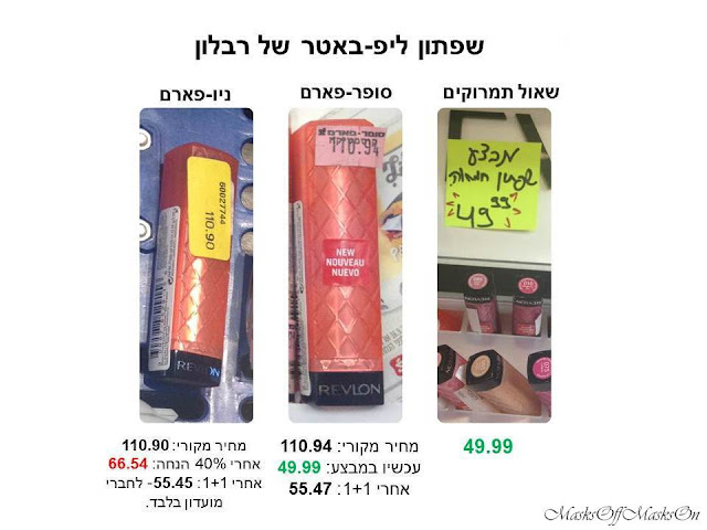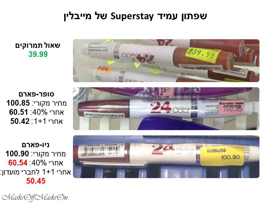 שפתון של מייבלין: שימו לב לפער של יותר מ-20 שקלים בין שאול לבין הפארמים אחרי מבצעים של 40% הנחה, ולפער של למעלה מ-15 שקלים כשהמוצרים עולים בפארמים 50% פחות מהמחיר המקורי- במסגרת מבצע 1+1.