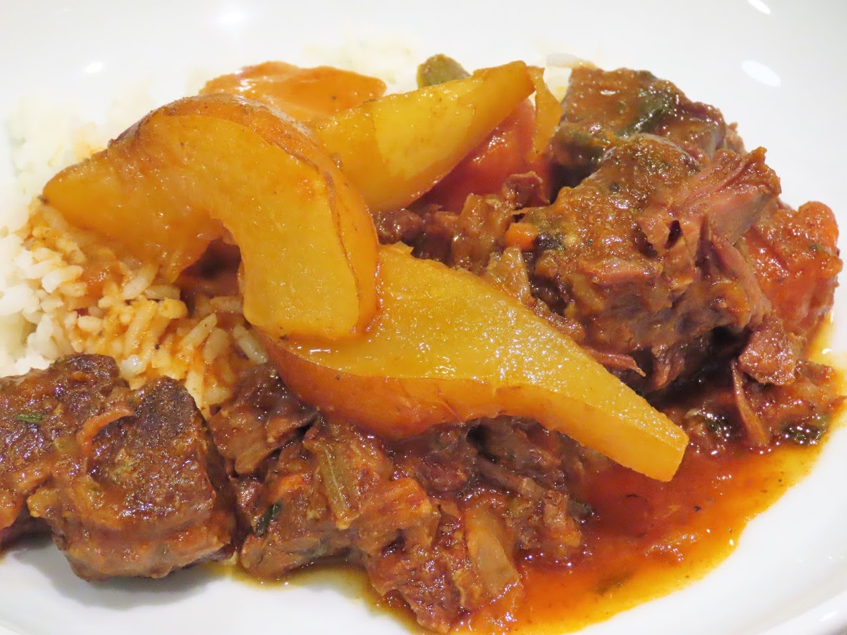 מתבלים את קוביות הבשר במלח ופלפל. בסיר רחב מחממים שמן זית וצורבים בו את קוביות הבשר במשך כמה דקות. מוציאים את הבשר מן הסיר. מוסיפים את הירקות החתוכים ועשבי התיבול ומטגנים עוד דקה או שתיים. מוסיפים את הפפריקות ועוד שתי כפות שמן זית ומטגנים מעט ולאחר מכן את רסק העגבניות. נזהרים שלא לחרוך אותו. מוסיפים לסיר חזרה את קוביות הבשר ומוסיפים מים כמעט עד כיסוי הבשר. מקרצפים היטב את תחתית הסיר בכף עץ. מכסים ומביאים לרתיחה. מבשלים על אש קטנה או בתנור בחום של 170 עד שקוביות הבשר רכות. מוסיפים לסיר את האגסים ומבשלים עוד 5-6 דקות. מגישים עם אורז לבן או פירה.