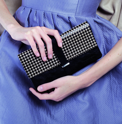 קלאץ' בדוגמת הפייה-דה-פול (פפיטה) המוכרת מעולם בדי הטוויד. צביעה בעיבוד כרום, העניקה ברק עכשיוי לדוגמה הקלאסית והמוכרת